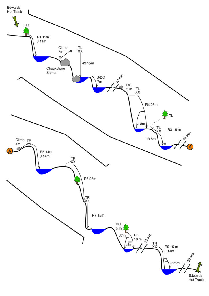 The only sequence feature is the large siphon at R2. Climb onto the TL to a single bolt for a belay and climb 7m to the anchor. Rap into a flat pool with 15m of rope out and swim with the flow around the corner, exiting on the left at the top of a 7m drop. Pull the rope from there, then downclimb/jump the waterfall.