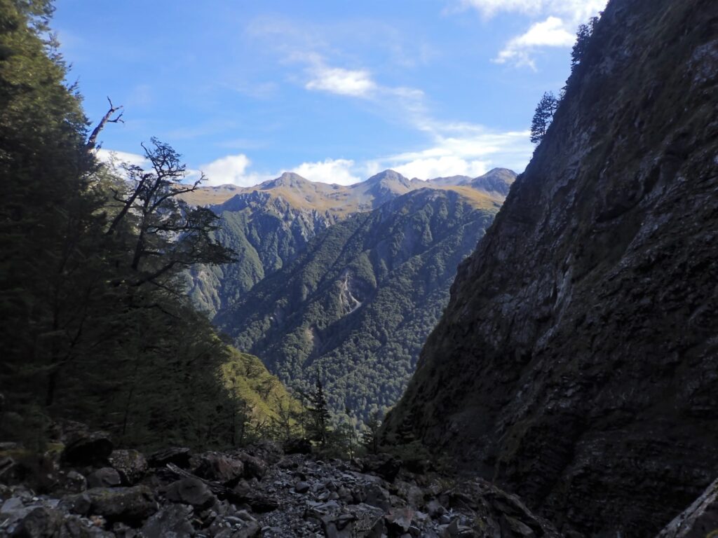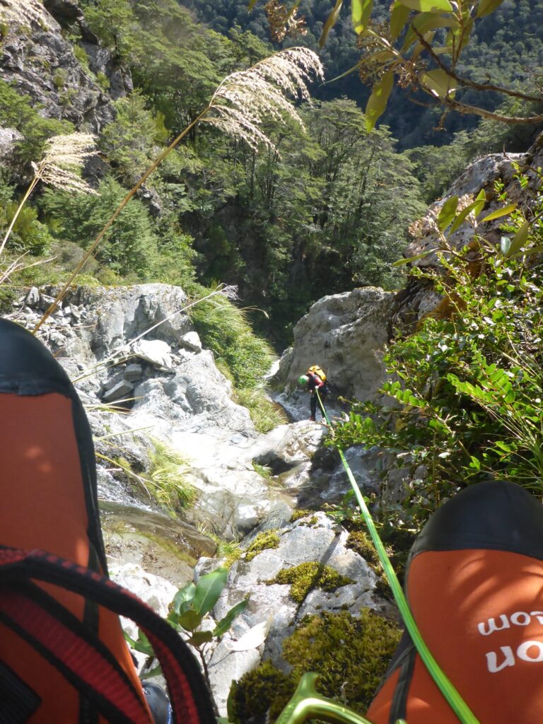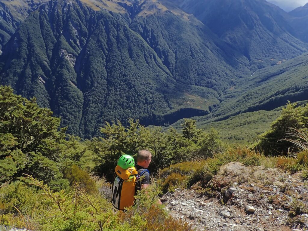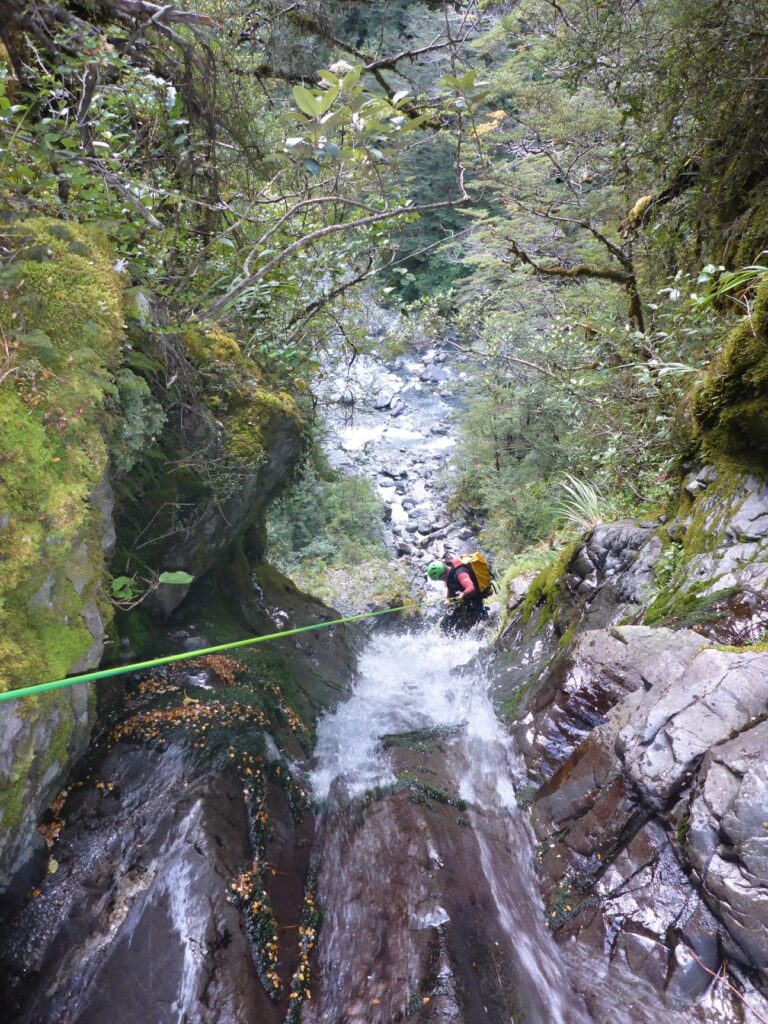 “We spotted the last drop when we descended the Mingha gorge 3 weeks back, and yesterday decided to follow it down from the tops. Crossed the river just before the boardwalks begin, and hiked directly up to Williams Saddle tarns. Beech forest provides good terrain, with a number of animal tracks to follow.