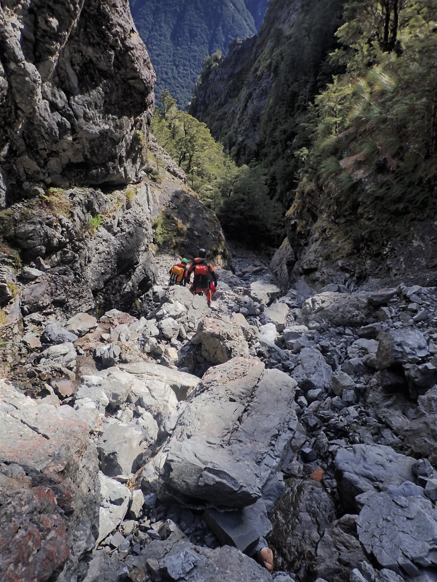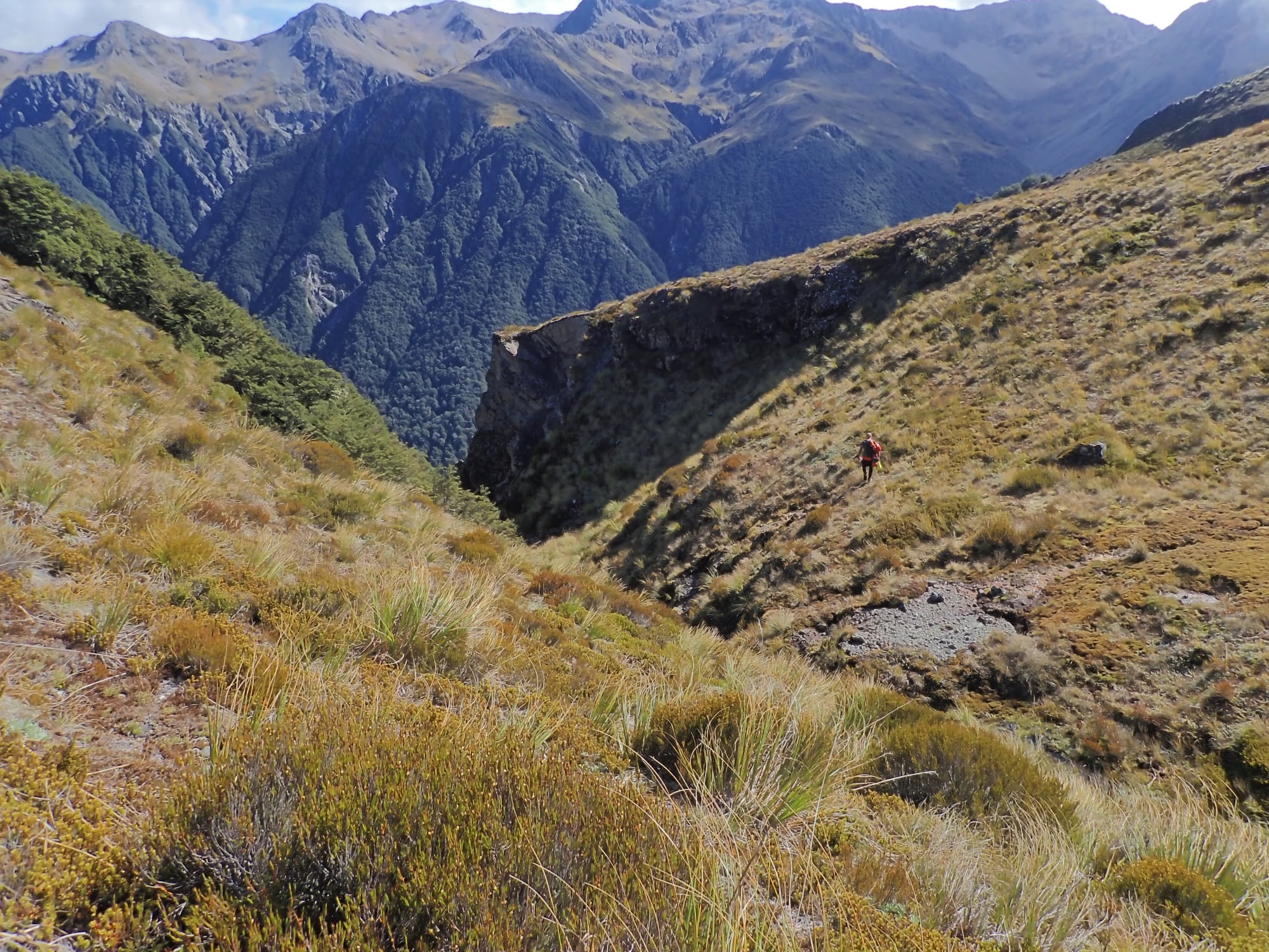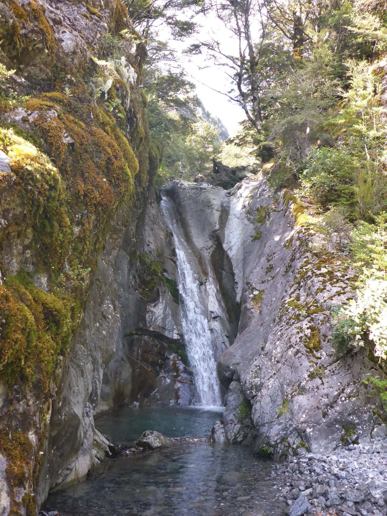 “We spotted the last drop when we descended the Mingha gorge 3 weeks back, and yesterday decided to follow it down from the tops. Crossed the river just before the boardwalks begin, and hiked directly up to Williams Saddle tarns. Beech forest provides good terrain, with a number of animal tracks to follow.